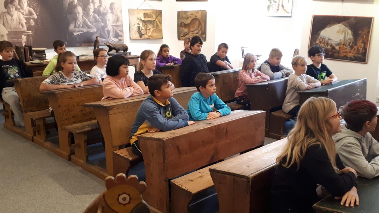 Druhá část exkurze nás zavedla o 100 let zpět, do školy, kde se klečelo na hrachu a pán učitel vládl pevnou rukou s rákoskou. Během jedné vyučovací hodiny si žáci vyzkoušeli číst, psát i počítat. Po hodině sezení v dřevěných lavicích a psaní na tabulky se všichni těšili zpět, do naší pohodlné a přívětivé školy.