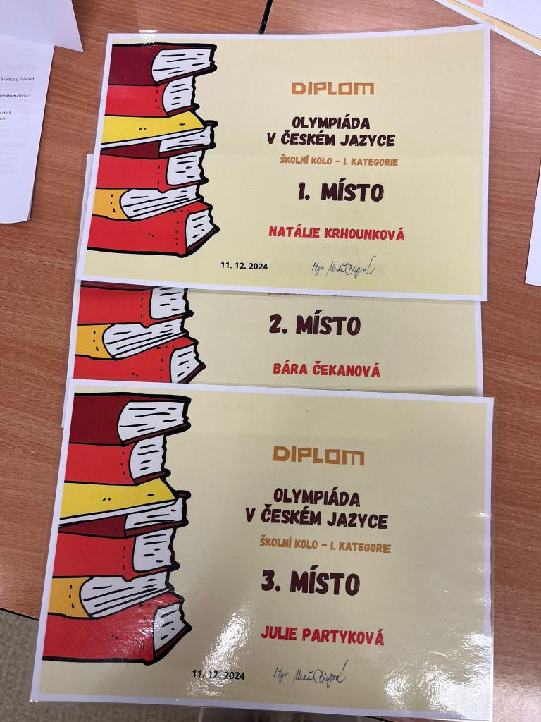 Olympiáda z českého jazyka měla osm úspěšných řešitelů. Do okresního kola jsou nominovány dvě nejlepší řešitelky: 1. místo: Natálie Krhounková a 2. místo: Bára Čekanová.