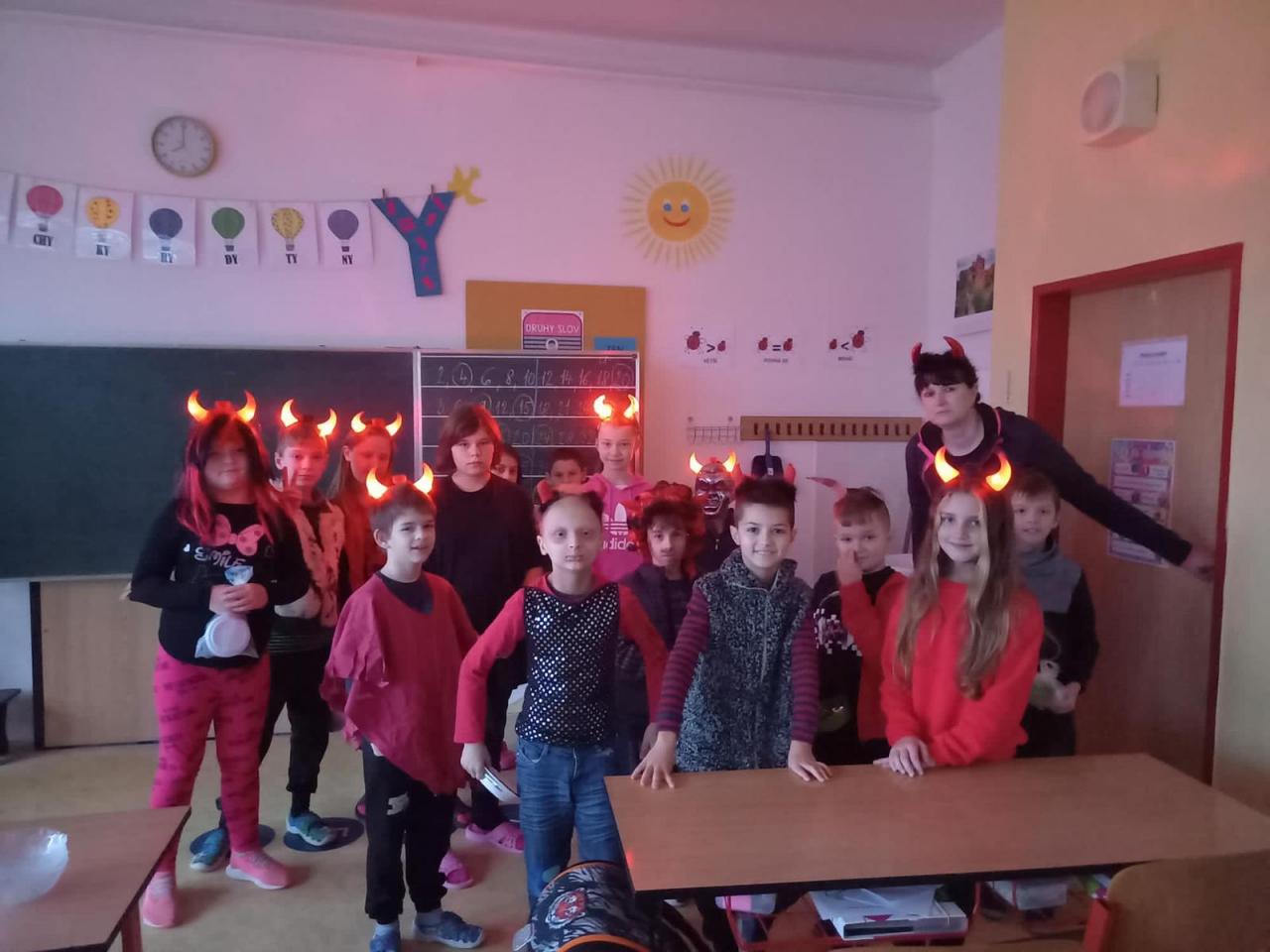 Kdyby dnes někdo nakoukl do 3.třídy, zjistil by, že se žáčci převlékli za čertíky a čertice. Černé oblečení, kožíšky a samozřejmě i svítící rohy – v tomto přestrojení hravě plnili všechny úkoly: vaření čertovského pudinku, skládání rozstříhaných obrázků, řešení matematických úkolů s Kleofášem, přiřazování čertovských přísloví k obrázkům. Ničeho se nezalekli, se vším si velmi zdařile poradili. Čertíci byli tak zaměstnaní, že ani nevnímali zvonění.